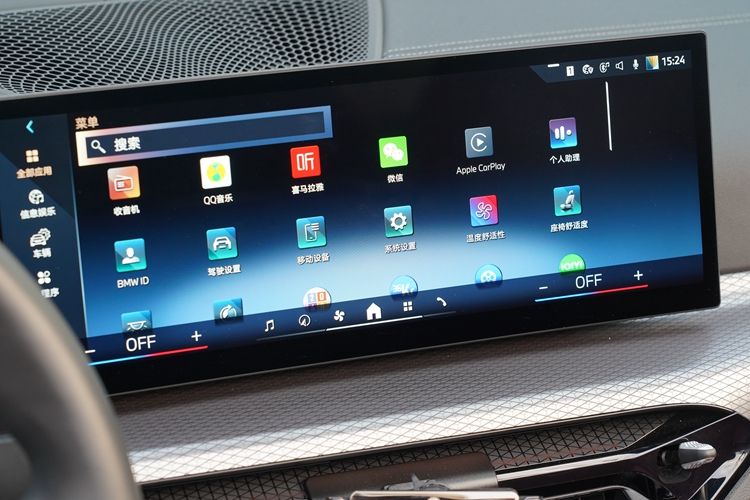 中控屏是一塊14.9英寸的液晶屏,與儀表盤聯為一體,懸浮造型,外觀很普通,缺乏設計感。車機配備高通驍龍8155P芯片,搭載寶馬的iDrive系統,車聯網、OTA升級、導航、路況顯示、應用商店等,一應俱全。